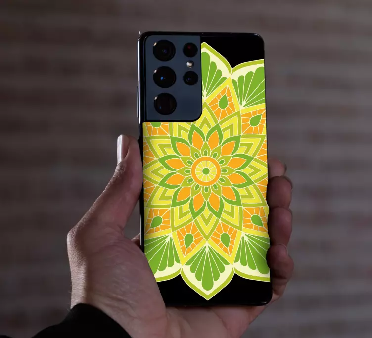 緑、黄色、オレンジの色合いで複雑な幾何学模様を特徴とする鮮やかな花のマンダラパターン。このデザインは自然の要素を組み合わせて調和のとれた目を引く外観を作り出し、個人のアイテムを引き立てるのに最適です。