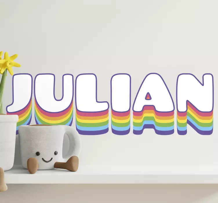 このカラフルな名前デザインは、文字全体に遊び心あふれる鮮やかな虹の効果を特徴としています。各キャラクターはスペクトルをシームレスに統合し、心地よい雰囲気を作り出します。子供のスペースをパーソナライズするのに最適で、個性を反映するカスタマイズが可能な明るいタッチを加えます。