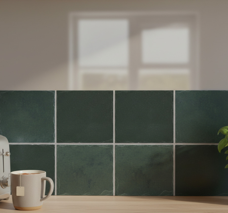 一組の正方形タイルはテクスチャーのある表面を持ち、魅力的なグリッドに配置されています。前景には、居心地の良いマグがコーヒーマシンの横に置かれ、温かみのあるキッチンの雰囲気を高めています。このデザインは、機能性とスタイルを強調しながら、どんな空間にもキャラクターを effortlessly 追加します。 動物 シール エバーグリーンスレート