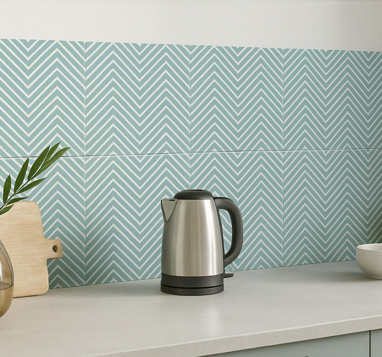 スタイリッシュなキッチンシーンが描かれており、明るい色のカウンタートップの上にスリークなケトルが置かれています。ケトルの後ろには、現代的なパターンのタイル壁がダイナミックなシェブロンデザインを示しており、視覚的な興味を加えています。豊かな緑とキッチンの装飾が全体的な美観を高め、居心地の良い現代的な雰囲気を作り出しています。