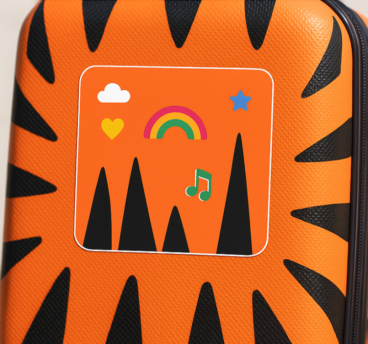鮮やかなデザインは、明るい背景に虹、音符、ハートといった遊び心あふれる要素を特徴としています。鋭いシルエットの山々が冒険心を加えています。これらの要素は、喜びと創造性を呼び起こし、個性や楽しさを求める人々にアピールします。 動物 シール アニマルプリントトランキ