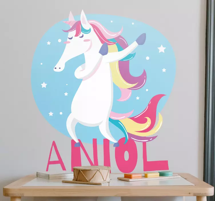 鮮やかなユニコーンが穏やかな青い背景の中で喜びに満ちて踊り、星々に囲まれています。このデザインは子供時代の夢や想像力の whimsical spirit を捉えており、個人の空間にぴったりの楽しい選択肢です。この製品はユニークなタッチを加えるためにパーソナライズすることができます。