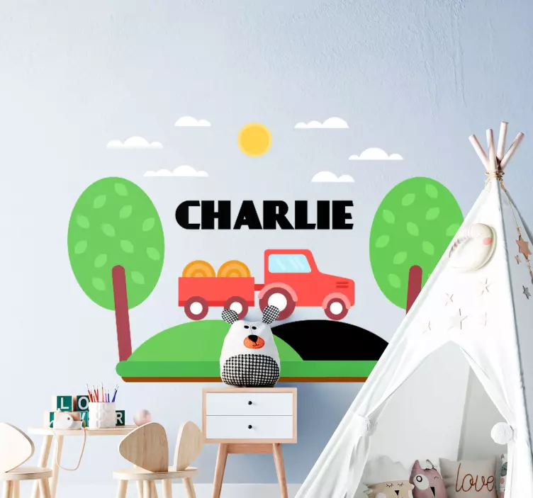 参考: A52091鮮やかなシーンで、赤いトラックが豊かな緑の丘を通って商品を運んでいます。スタイライズされた木々と明るい太陽が両側にあります。この作品は遊び心を加え、子供部屋にぴったりで、個人的なカスタマイズも可能です。