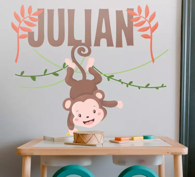 魅力的なデザインで、可愛い猿がつるから逆さまにぶら下がっています。このデザインには鮮やかな葉が含まれており、個別のカスタマイズオプションがあるため、子供の空間にぴったりです。猿の遊び心あふれる表情は、どんな環境にも楽しい雰囲気を加えます。