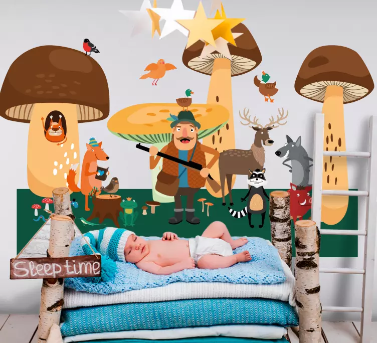 参考: A49201森の中で様々な遊び心満載の動物たちが描かれた楽しいシーン。これは、幻想的なキノコや、野生動物とふれあう陽気なキャラクターを含みます。子供たちの空間に魔法のような雰囲気を作り出し、想像力や自然への愛を育むのに最適です。