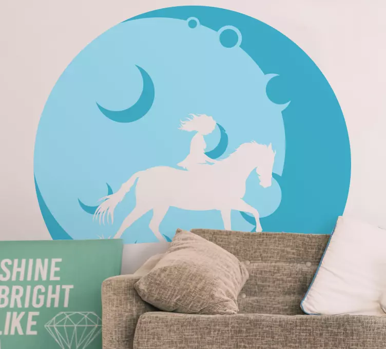 参考: A48385穏やかな青い月の背景に対して馬に乗る女の子を描いた魅力的なシーン。シルエットが夢のような雰囲気を生み出し、自由と冒険の感情を呼び起こします。このデザインは自然の中での幻想的な旅の本質を捉え、子供部屋を引き立てるのにぴったりです。