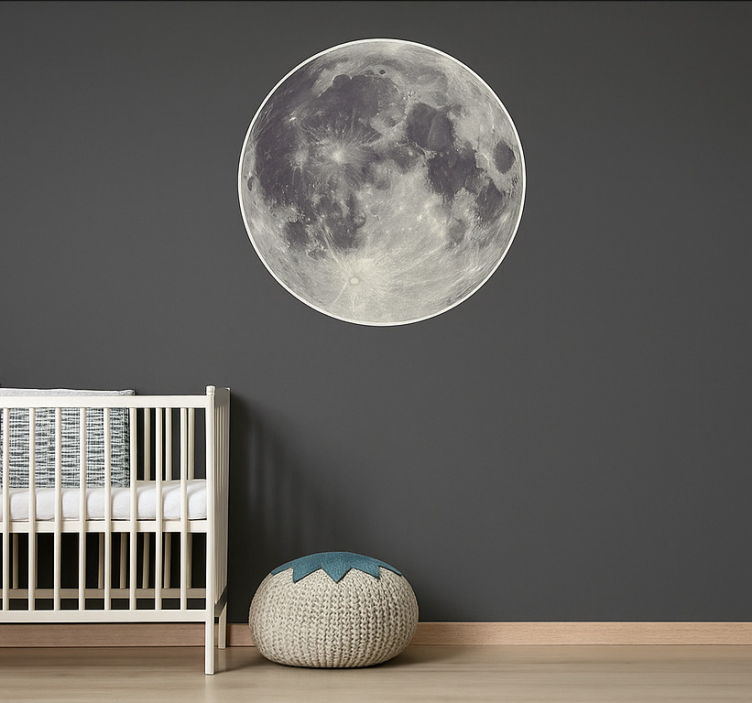 穏やかな壁の装飾で、詳細に描かれた月の表現が特徴です。そのリアルな質感と陰影が深みを与え、落ち着いた雰囲気を作り出します。特にナーサリーに最適で、空想的な魅力で空間を引き立てます。引用句「To the moon and back」は、永遠の愛と愛する人のためにどれほどのことをするかを象徴しています。
