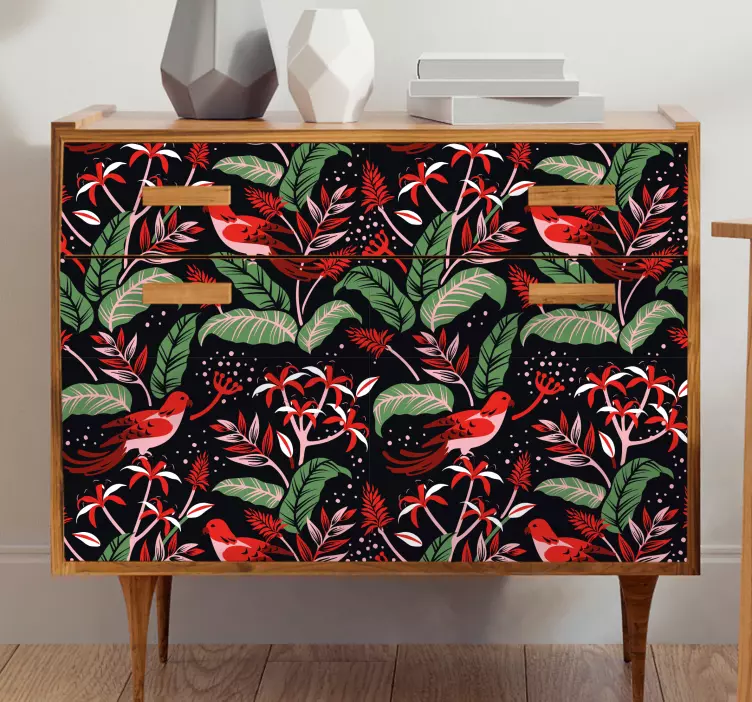 ダークな背景に対して、赤い鳥と豊かな緑の葉が特徴の活気あるトロピカルフラワーパターン。デザインはさまざまな花の要素を取り入れ、鮮やかな色合いでエネルギッシュで新鮮な雰囲気を生み出しており、どんな環境にも自然のタッチを加えるのにぴったりです。