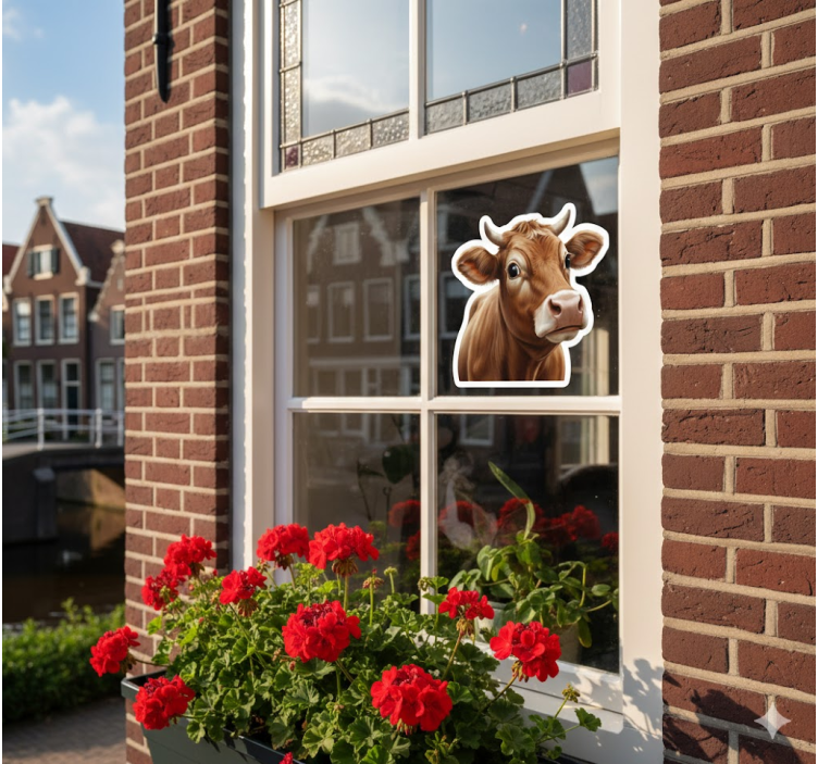 牛の頭がユーモラスなイラストで描かれ、魅力的なレンガの壁と咲き誇るゼラニウムを背景にしています。自然の要素と鮮やかなイメージの組み合わせが生き生きとした雰囲気を生み出し、田舎の魅力と遊び心を呼び起こします。