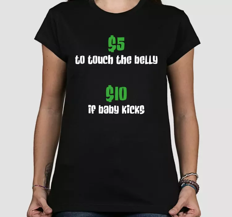 この遊び心満載のデザインは、妊娠中のやり取りをユーモラスに表現しており、黒い背景に大胆な緑のテキストが特徴です。赤ちゃんのバンプに触れることを提案する軽やかなアイデアを、遊び心あふれる価格で提示しており、妊娠中の親やベビーシャワーにぴったりです。