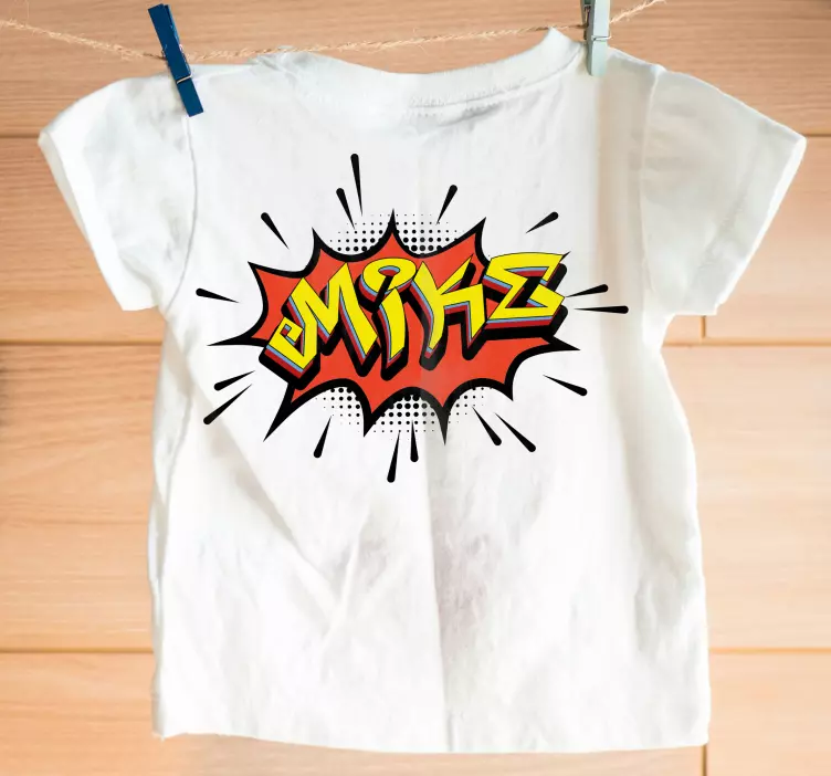 この遊び心あふれるデザインは、活気に満ちたコミックスタイルのバーストを特徴としており、名前「Mike」が目立つように表示されています。大胆な色使いとダイナミックな形状がエネルギッシュな魅力を生み出し、子供たちにとって楽しく明るい雰囲気にぴったりです。