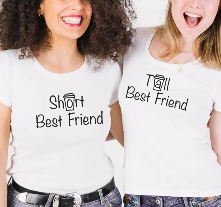この画像には、身長をユーモラスに示すお揃いのシャツを着た二人の友達が写っています。一方のシャツには「Short Best Friend」と書かれており、もう一方には「Tall Best Friend」と書かれています。この遊び心のあるテキストは、彼らの友情とつながりを強調しています。