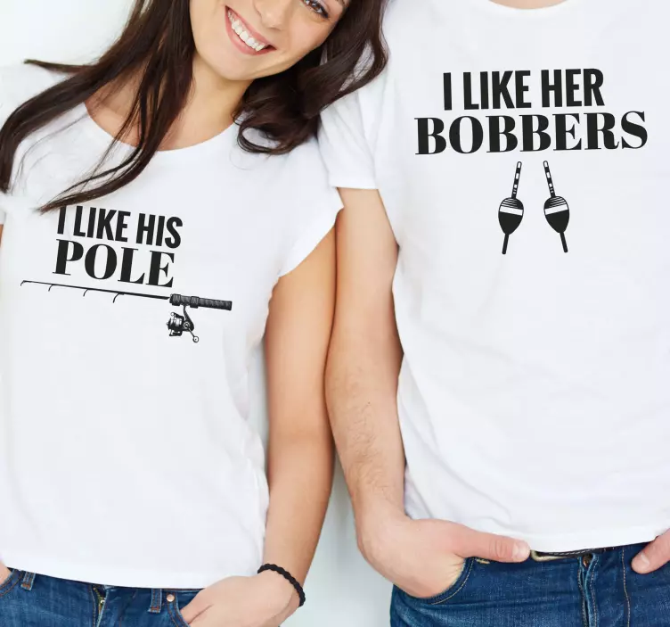 この画像は、ユーモラスな釣りに関する引用が描かれた遊び心満載のシャツを着たカップルを紹介しています。各シャツにはウィットに富んだフレーズが強調されており、釣りを楽しむカップルにぴったりの楽しい魅力を兼ね備えています。このデザインは、着る人も見る人も楽しませること間違いなしの軽やかなテーマを取り入れています。