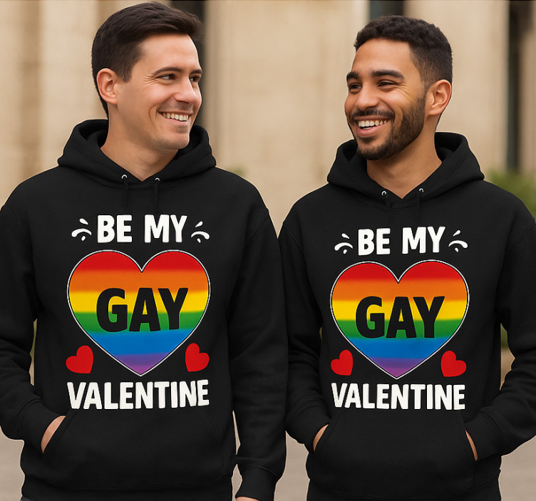 二人の笑顔の男性が、カラフルなデザインのマッチング黒のフーディを着ています。グラフィックには、虹色で満たされた大きなハートと、目立つように表示されたテキスト「BE MY GAY VALENTINE」が描かれています。魅力的な赤いハートで飾られたこのアパレルは、愛と包括性を体現しており、LGBTQ+の関係を祝うのにぴったりです。