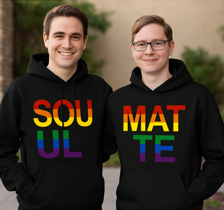2人の若い男性が黒のフーディを着て、カラフルな文字を披露しています。1つのフーディには「SOUL」という言葉が、もう1つには「MATE」と書かれています。それぞれの文字には虹のパターンが施されており、プライドと団結を象徴しています。背景は柔らかくぼかされており、彼らの明るい表情とスタイリッシュな服装が際立ち、友情の瞬間を捉えています。