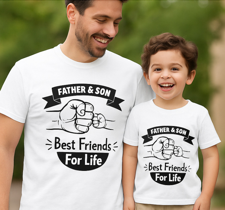 陽気な父と息子のデュオが、マッチングの白いTシャツを着て笑顔を見せています。遊び心のあるデザインには、彼らの強い絆を象徴するフィストバンプが描かれています。太字のテキストには 'Father & Son' と 'Best Friends For Life' が記されており、彼らの愛情深い関係を強調しています。アウトドアの背景が温かく、招待するような雰囲気を加えています。