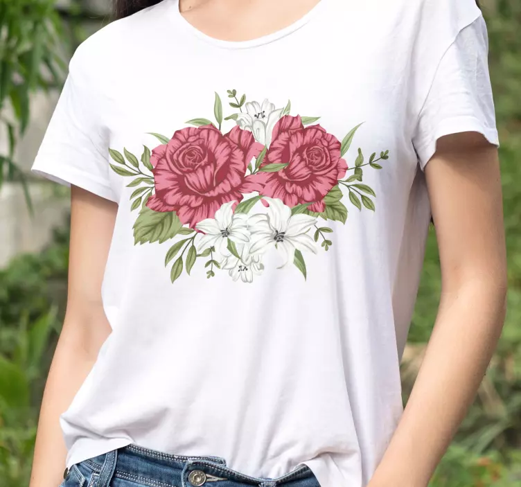 このデザインは、美しさとエレガンスを象徴する咲き誇るバラとユリを特徴としています。鮮やかな色合いが際立ち、印象的なビジュアルアピールを生み出しています。カジュアルウェアに最適で、花の要素が調和して融合しており、新鮮で uplifting な雰囲気を伝えたい人にとって理想的な選択となっています。
