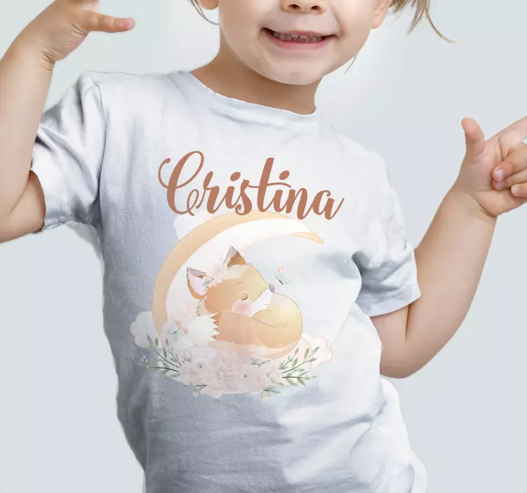 この愛らしいデザインは、花と三日月で飾られた眠っている狐を特徴としています。柔らかいカラーパレットが魅力を引き立て、子供たちにぴったりです。パーソナライズされた名前がユニークなアクセントを加え、カスタマイズされたアパレルを探している親たちにアピールします。