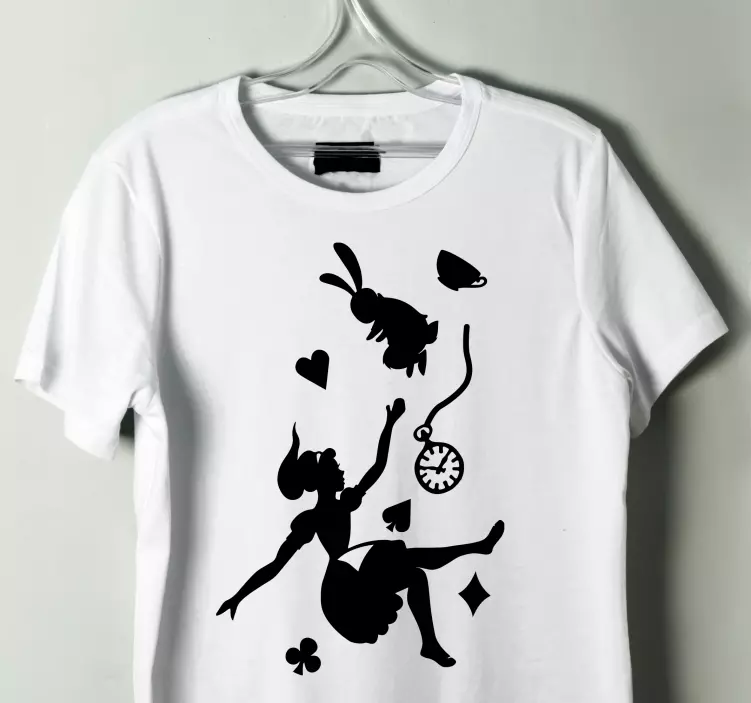 私たちの子供 t シャツ お茶会の楽しいひとときは、ウサギが落ちていく不思議の国のアリスをテーマにしたデザインです!このユニークなグラフィックには、見るハーツのキャラクターやシルエット、そしてアリスが登場します。懐中時計や気まぐれなシルエットが描かれ、子供たちが夢の世界に飛び込む手助けをします。お茶会の楽しさを感じさせるこの T シャツは、特別な瞬間を彩ります。
