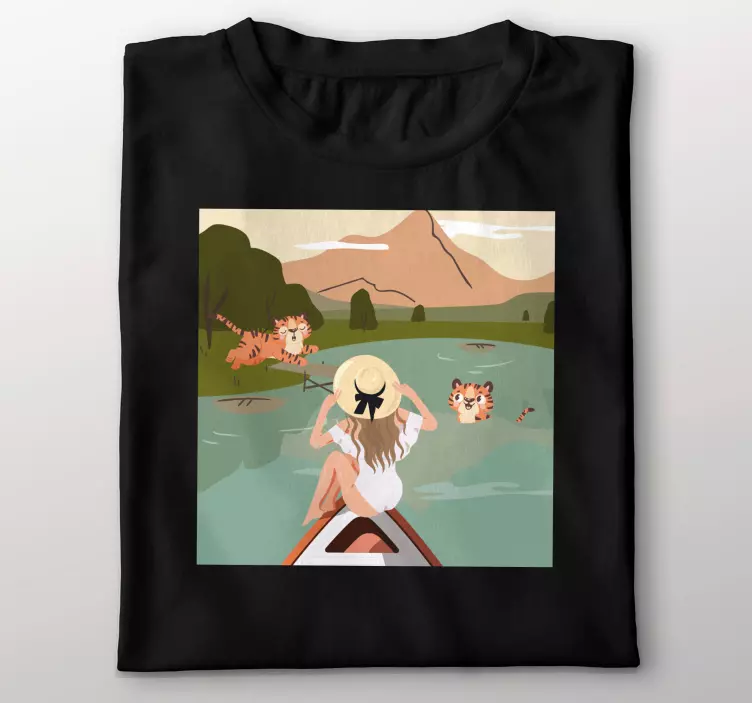 このデザインは、帽子をかぶった女性が水面で穏やかな瞬間を楽しんでいる静かなアウトドアシーンを描いています。遊び心あふれる2匹のトラが現れ、この穏やかな設定に楽しさを加えています。アートワークは、美しい色合いと生き生きとしたキャラクターで魅了します。