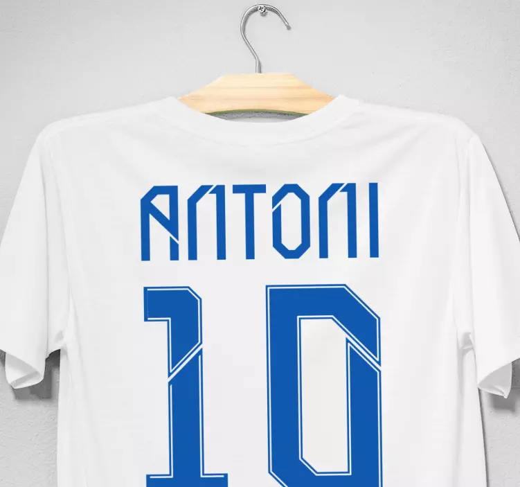 このデザインは、印象的なスタイルでパーソナライズされた名前と番号を示しています。太字のタイポグラフィは「Antoni」という名前と「10」という番号を強調し、スポーツ愛好者に適したダイナミックで目を引くルックを作り出しています。