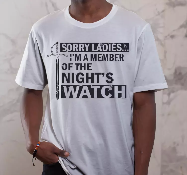 この白いシャツは、「night's watch」のメンバーシップを強調する大胆なメッセージと、印象的な剣のグラフィックが特徴です。カジュアルな快適さを楽しみながら、自分のファンダムをユーモラスにアピールしたい方にぴったりです。