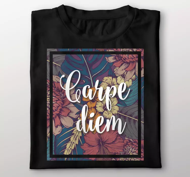 この鮮やかなデザインは、カラフルな花の要素と絡み合ったフレーズ 'Carpe Diem' を特徴としています。黒いベースが、力強く明るい色合いを引き立て、心を uplift する視覚体験を生み出します。美しさとモチベーションの表現を兼ね備えたものを好む人々に最適です。