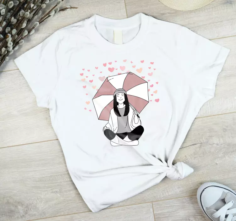 この魅力的なデザインは、ハートで飾られた鮮やかな傘を持つ女性を描いています。明るい表情とカジュアルな服装が温かい雰囲気を生み出し、愛と喜びを祝っています。楽しく魅力的なアイテムをワードローブに加えたい方にぴったりです。