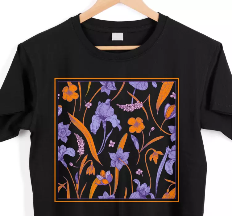 このデザインは鮮やかな花柄を特徴としており、対照的な背景に紫とオレンジの花が混ざり合っています。複雑なディテールと生き生きとした色合いが新鮮でエレガントな印象を与え、さまざまな場面やお祝いに適しています。