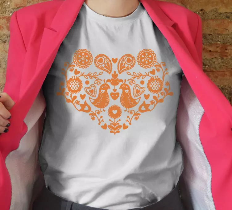 私たちのシャツハートパターンバードは、研磨されたデザインが施され、民間伝承のエッセンスを感じさせる一品です。フォークや花々、愛に満ちた心臓のモチーフが美しく組み合わさり、鳥たちが華やかに舞い上がる様子が描かれています。この伝統的なスタイルは、黒と白のコントラストによって引き立てられ、どんなシーンでも目を引く存在感を放ちます。