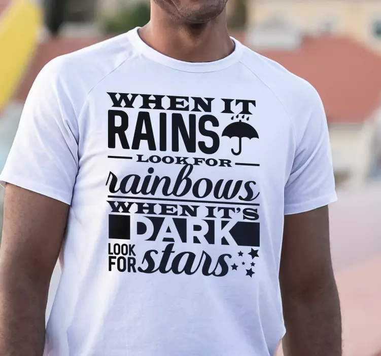 このスタイリッシュなトップスは、ポジティブなマインドセットを促す「uplifting phrase」を特徴としています。デザインは雨、虹、星のイメージを巧みに組み合わせており、困難な時期にモチベーションを求める人にとって考えられた選択です。