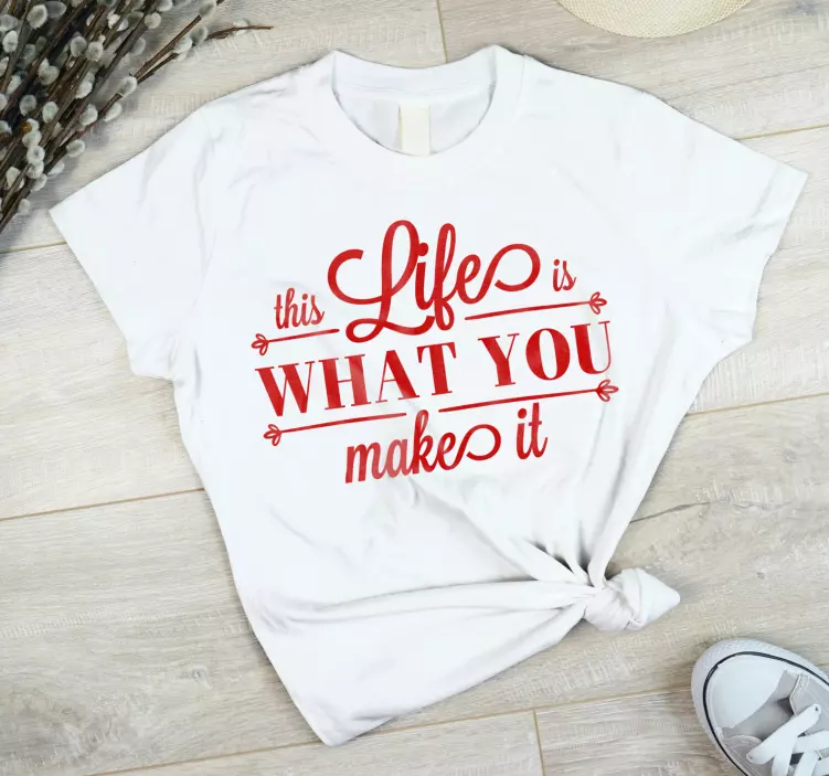 このデザインは、「life being what you make of it」というテーマを強調する力強いモチベーショナルクォートを特徴としています。太字の文字と鮮やかな色使いが目を引き、カジュアルウェアとしてポジティブさをインスパイアするのに最適な選択です。