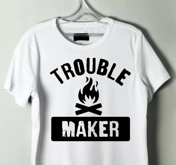 この目を引くデザインは、'Trouble Maker'という太文字のテキストと炎とキャンプファイヤーのシンボルが組み合わさっています。楽しさと冒険心を大切にする人にぴったりです。黒と白のコントラストが興奮を生み出し、自然に注目を集めます。