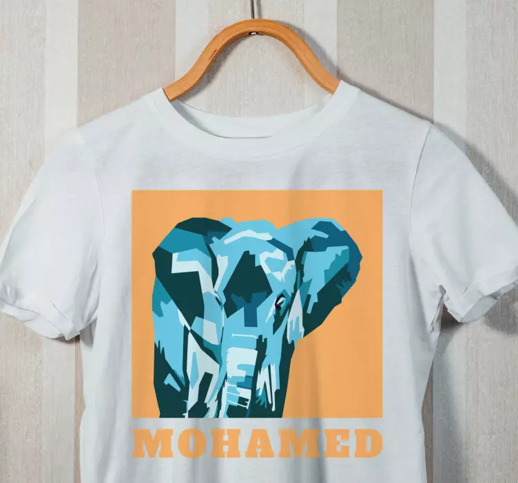 このデザインは、鮮やかな幾何学的形状で作られた印象的な象のポートレートを展示しています。カラーパレットは、オレンジの背景に補完されたさまざまな青の色合いを特徴としており、魅力的な作品となっています。「Mohamed」という名前が目立つように表示されており、個人的なタッチを加えています。