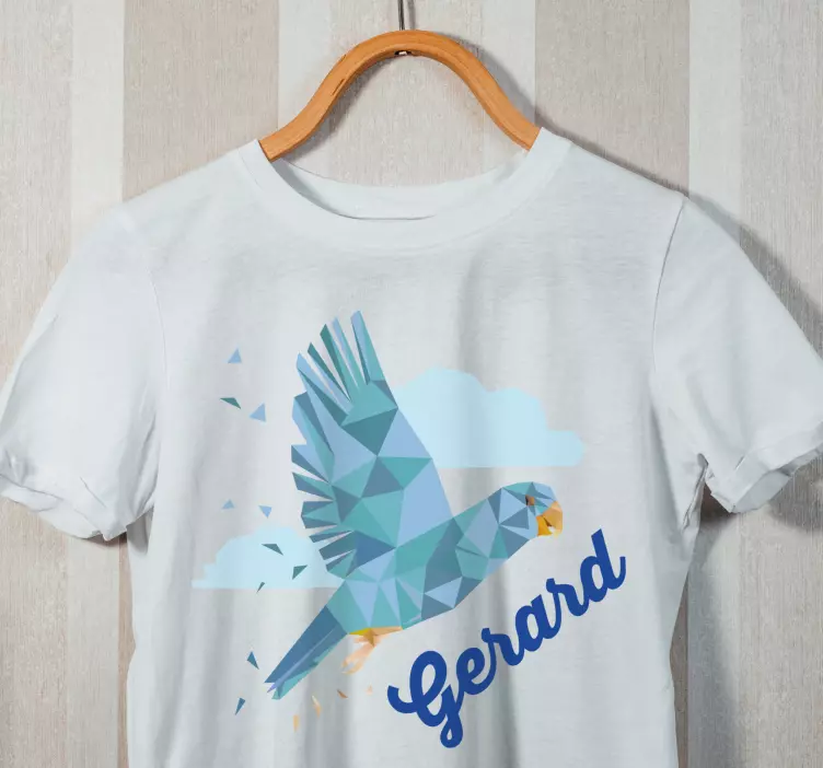 このデザインは、飛んでいるオウムの幾何学的な表現と柔らかな雲を組み合わせています。鮮やかな青のトーンがダイナミックな印象を与え、名前「Gerard」が個人的なタッチを加えています。ユニークで目を引くアートワークを好む方にぴったりです。