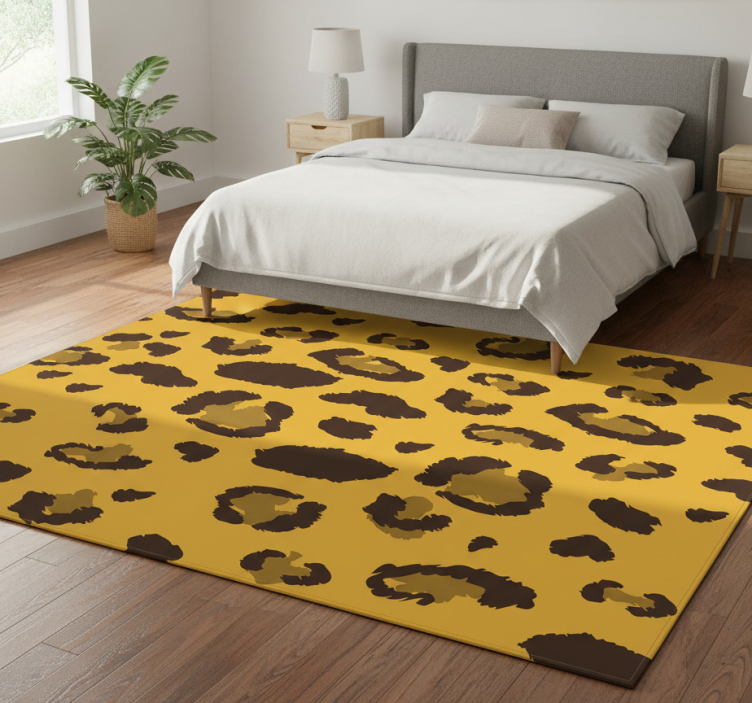 このデザインは、さまざまな動物柄のパターンで飾られた鮮やかな黄色の背景を特徴としています。さまざまなダークブラウンとオーカーの斑点が目立って散りばめられており、自然主義的なテーマを表現しています。形はサイズが異なり、動的な輪郭を描いており、明るい黄色のベースに対して際立ったコントラストを提供しています。 寝室 ビニールマット ヒョウ柄動物プリント家具