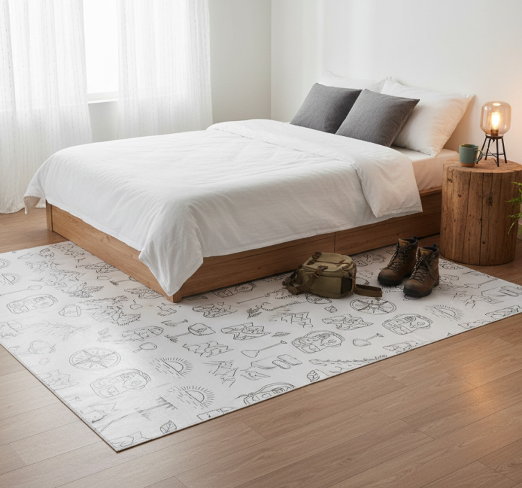 この画像は、さまざまな詳細なイラストで飾られた明るい背景を示しています。木々、山、コンパス、地図などの要素が特徴で、デザインはバックパックやキャンプのモチーフで補完されています。描かれている絵は主に黒で、白い背景とのコントラストが際立ち、アウトドアアドベンチャーのテーマを引き立てています。 寝室 ビニールマット 手描きのコンパスと山のアイテム