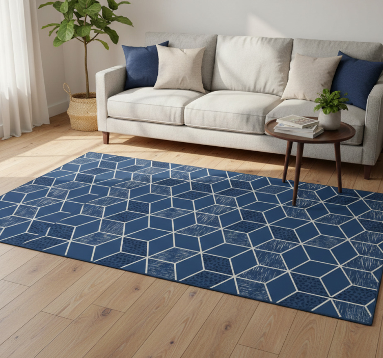 複雑に組み合わされた六角形の形状が特徴のデザインは、各六角形の内部に繊細なテクスチャーを持つ様々な青の色合いを取り入れています。クリーンな白いアウトラインが幾何学模様を引き立て、深い青の背景に対して視覚的に印象的なコントラストを生み出しています。 幾何学的なビニールマット ディストレスド・ヴィットリア