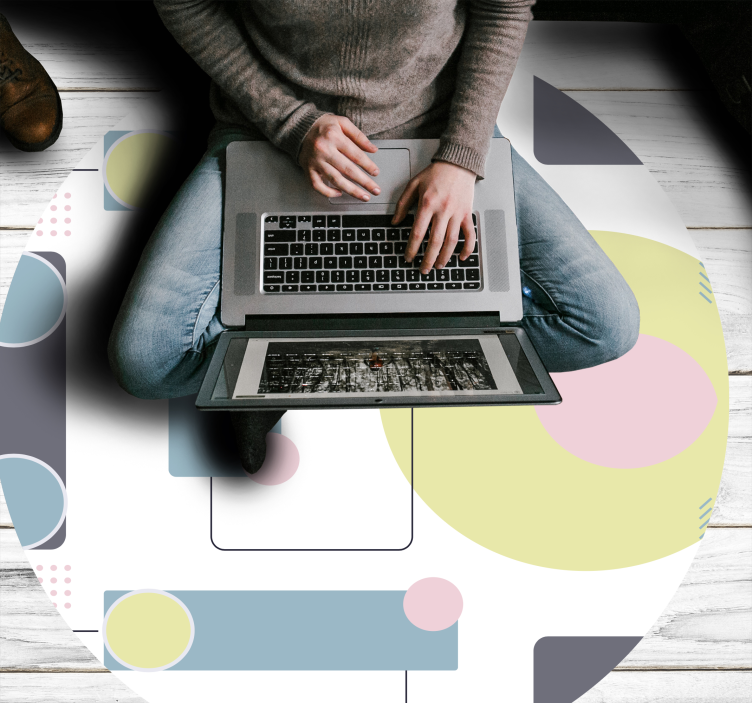 この幾何学的なビニールマットは、抽象的な円形デザインで構成され、青い、ピンク、黄色の鮮やかな色彩が目を引きます。その現代的なスタイルは、どんなインテリアにもマッチし、空間にモダンな雰囲気をもたらします。独特の形とパターンが視覚的なインパクトを与え、あなたの生活空間を活気づけます。