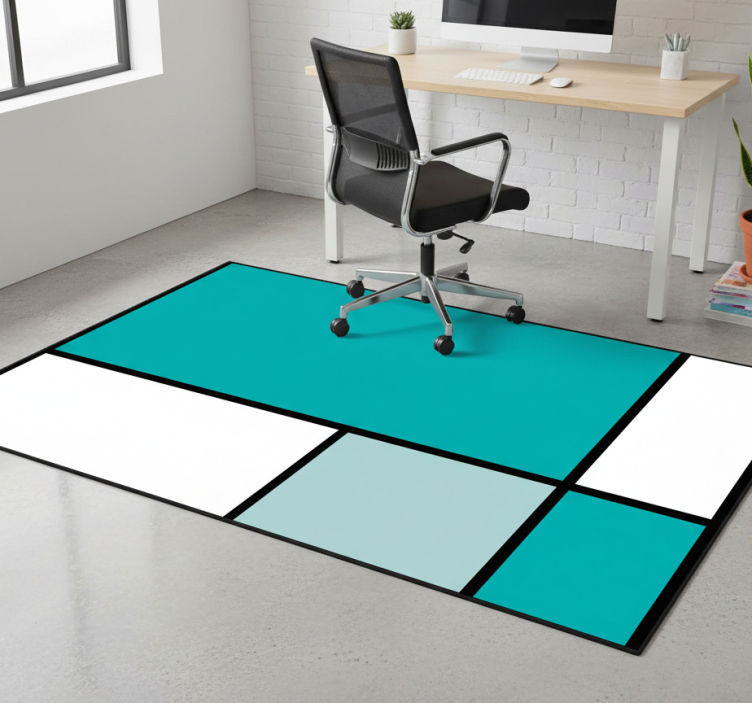 デザインは、異なる色合いのティール、ライトブルー、ホワイトの長方形ブロックを用いた幾何学的なレイアウトを特徴としています。各セクションは太い黒いボーダーで囲まれ、色の間に明確な区切りを作り出しています。この配置は、クリーンなラインと鮮やかな色合いを強調し、モダンでグラフィックな美学を呈示しています。