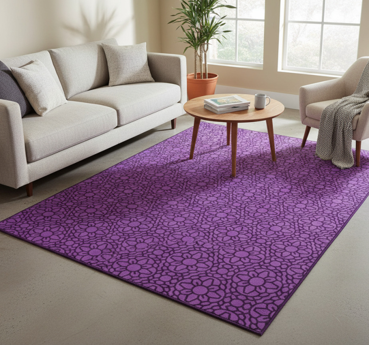 鮮やかな紫のラグは、繰り返しの花や丸い形のデザインが施された複雑な花柄パターンを特徴としています。整然とした対称的な配置が視覚的な魅力を高め、どんな空間にも活気を与えます。紫の背景に対する暗い輪郭の相互作用が、全体のデザインに深みとテクスチャーを加えています。 幾何学的なビニールマット紫の円形の花