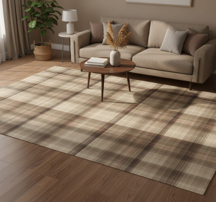 幾何学的デザインは、クリーム、ベージュ、アースブラウンの交互のバンドが特徴のクラシックなチェック柄を持っています。チェックは均等に配置されており、シンプルさを強調しつつ、温かみと快適さを提供する対称的なレイアウトを作り出しています。微妙な色の変化が全体のデザインに深みを加えています。