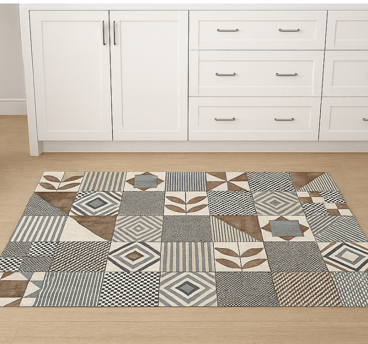 パッチワークデザインを特徴とするこの画像は、茶色、灰色、クリームの muted tones で様々な幾何学模様やモチーフを表示しています。デザインにはストライプ、チェック、ダイヤモンド、花の要素が組み込まれており、表面全体にわたって交互に配置された形やテクスチャの視覚的に興味深い構成を生み出しています。