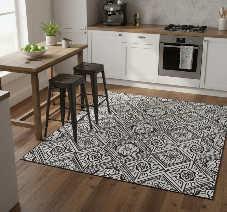 デザインは、さまざまな幾何学的形状と花のモチーフからなる印象的なモノクロパターンを特徴としています。対称的な配置には精緻なディテールが見られ、視覚的に魅力的な構成を生み出しています。各セクションは慎重にアウトラインされており、黒と白の要素のコントラストを際立たせています。 キッチン マット ビニール 大胆なコントラストの万華鏡