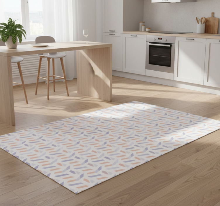 デザインは、柔らかなピーチ、ラベンダー、ホワイトの色合いで構成された、交互に組み合わさった幾何学的形状の生き生きとしたパターンを特徴としています。この配置はリズミカルな流れを生み出し、異なる角度や方向が動的な視覚体験に寄与しています。全体的な効果は現代的で視覚的に魅力的であり、現代的な環境に最適です。 キッチン マット ビニール 北欧風幾何学模様