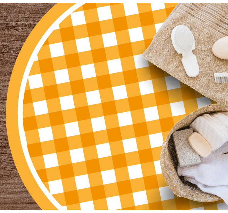 鮮やかで温かみのあるチェック柄は、オレンジと白の交互の四角形が特徴で、遊び心がありながらも心地よい印象を与えています。このデザインは円形で、オレンジの無地の縁取りが施されており、目を引く明るいビジュアルを生み出しています。