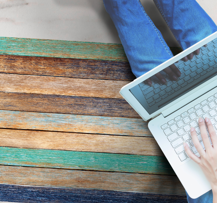 さまざまな茶色、緑、青の色合いの木の板が並ぶ鮮やかなデザイン。質感は素朴で、自然な欠陥や色の変化を示し、温かく魅力的な雰囲気を作り出しています。