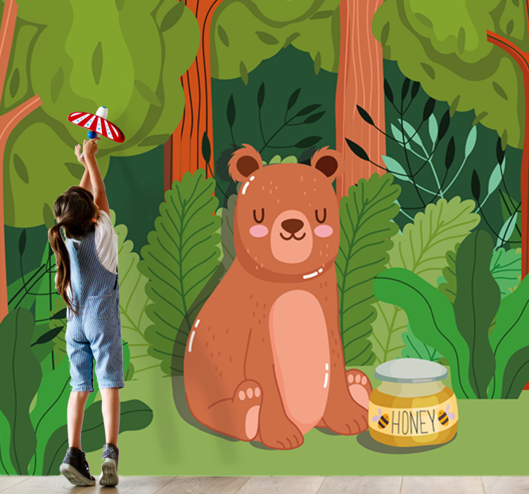 子供の寝室に最適なかわいいクマのアート作品を使用して、楽しい森林の雰囲気を演出しましょう。自然の中にいるような気分を味わえるこの壁画は、くまと蜂蜜、そして動物たちが描かれた優しいデザインが特徴です。お子様の想像力をかき立てる素敵な空間を作り出します!