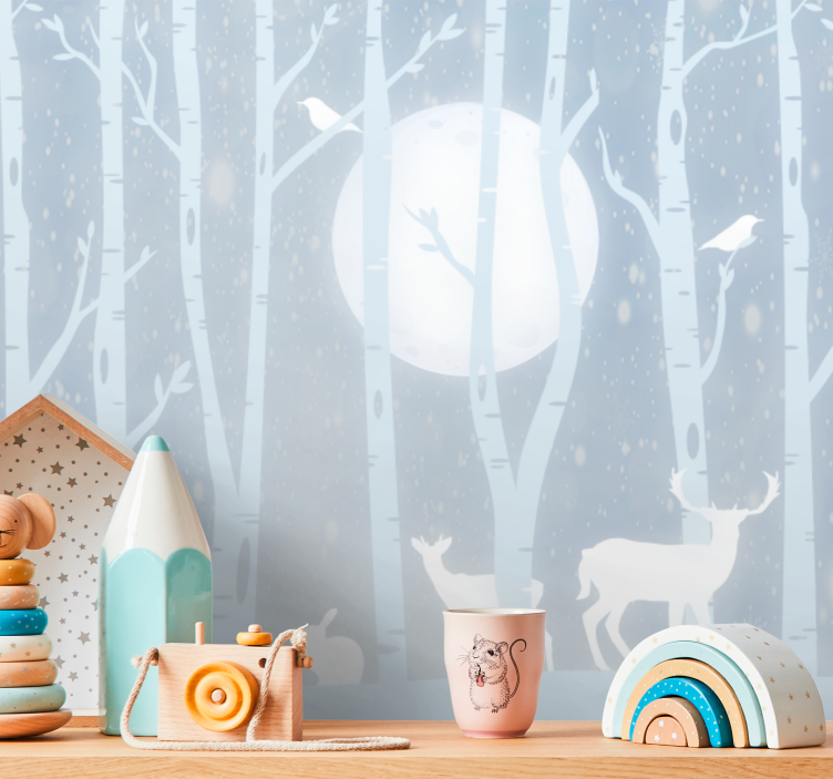 子供の寝室にぴったりの壁画です。この美しいデザインは、鹿や月、森林の壮大な風景を描いており、動物や鳥たちが夜空を舞う様子が表現されています。自然の魅力を感じさせるこの作品は、子供たちの想像力をかき立てることでしょう!