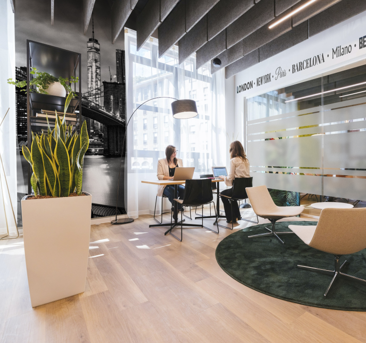 現代的なオフィススペースには、会議を行っている二人の個人が描かれており、象徴的なランドマークを展示した印象的な都市のスカイラインの壁画があります。鮮やかな植物が自然の要素を加え、インタラクティブな環境を一層引き立てています。デザインは、都市生活とプロフェッショナルなコラボレーションの融合を強調しています。